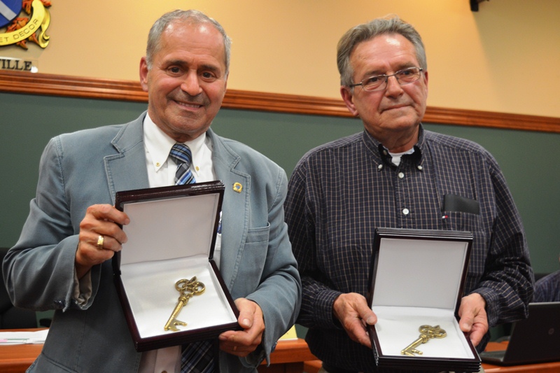 Les deux politiciens ont d’abord été honorés lors des assises de l’Union des municipalités du Québec qui se déroulaient du 21 au 23 mai. Toutefois, leurs collègues souhaitaient souligner leur apport à la communauté pour laquelle ils se dévouent depuis plus de 20 ans.