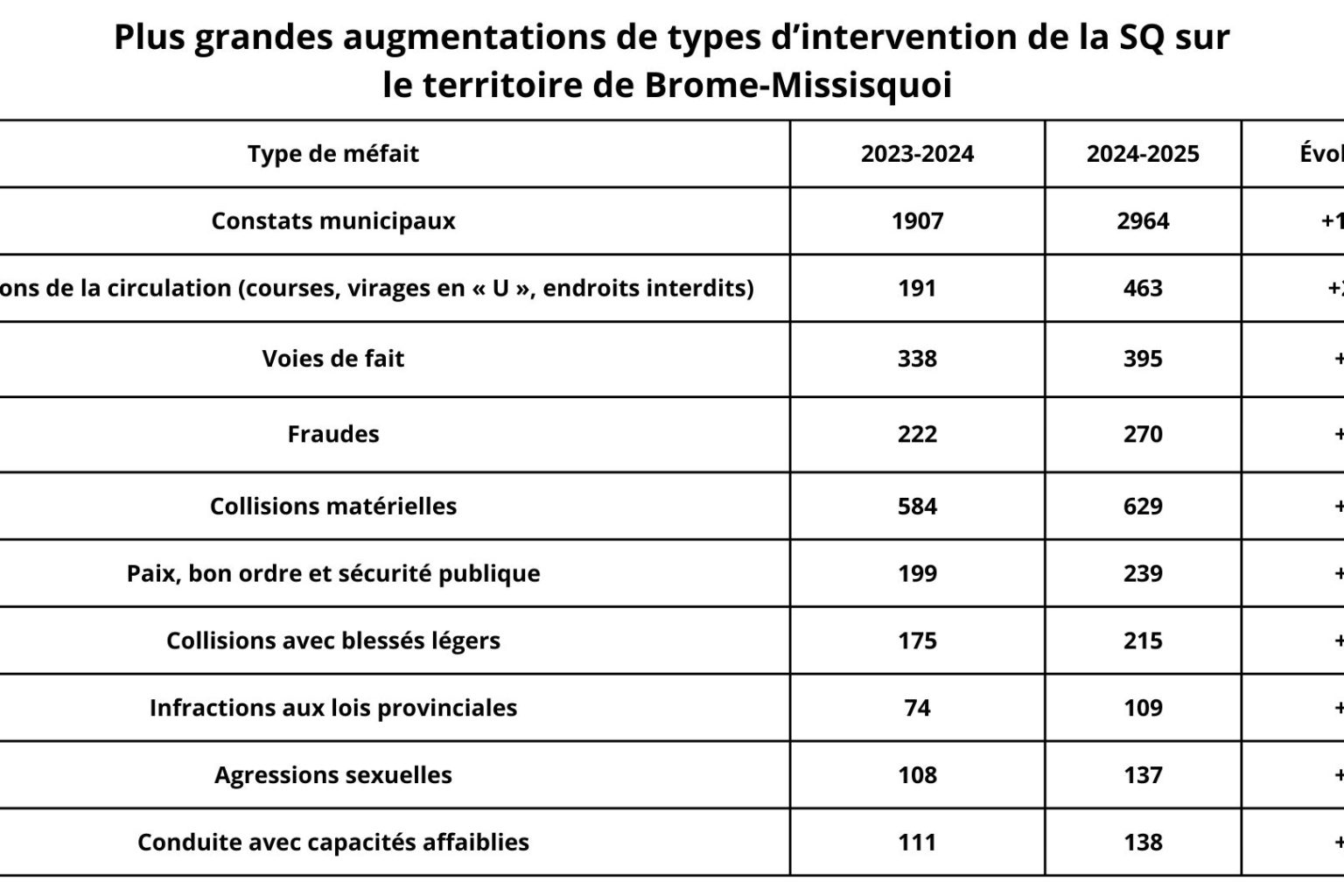 Pour ce qui est des interventions en tout genre, la SQ a également noté une hausse, passant de 6767 à 7205 en un an. Parmi ceux-ci, les constats municipaux ont connu la plus grande augmentation, passant de 1907 en 2023-2024 à 2964 en 2024-2025. Au contraire, les constats provinciaux ont diminué, passant de 1274 à 664.