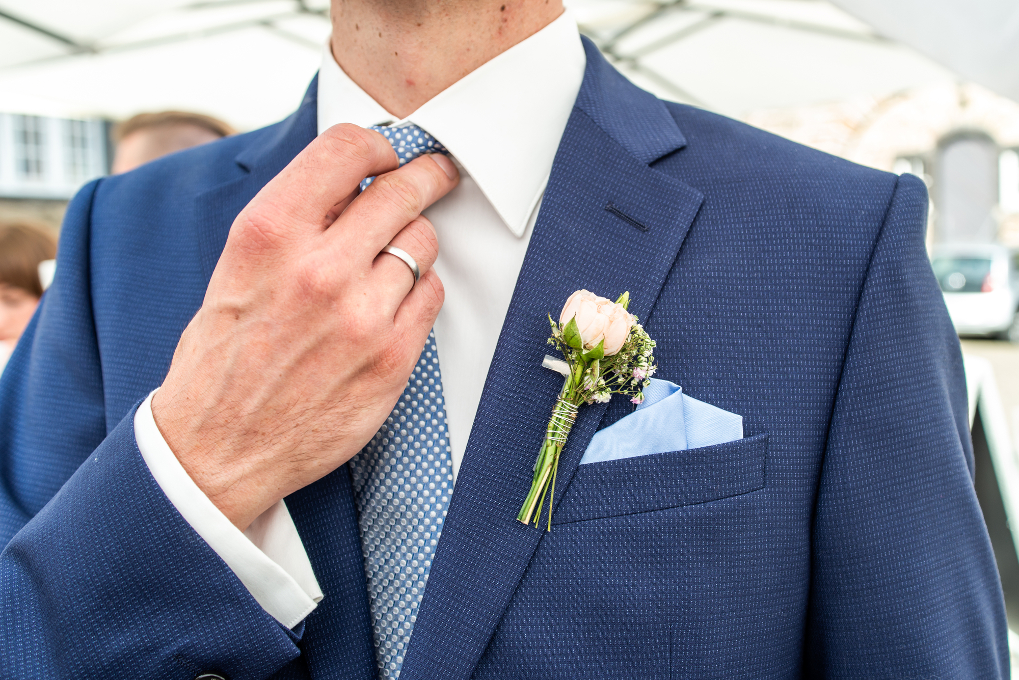 - Une pochette de costume blanche, bien pliée : Une pochette de costume est un morceau de tissu carré en lin, en coton ou en soie que l’on insère dans sa poche de veste en la laissant légèrement dépasser.